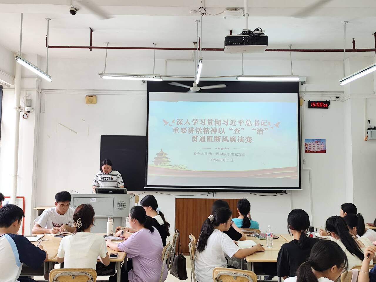 学生党员代表围绕四个主题展开分享,一是学习习近平总书记关于“风腐同查同治”的重要论述及意义;二是强化政治信念,筑牢“不想腐”的思想根基;三是大学生党员如何增强纪律意识;四是做到“查”“治”贯通。