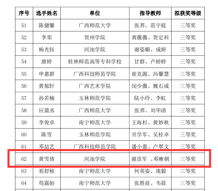 5月25日至26日,2024年全区师范生教学技能大赛在南宁师范大学明秀校区文星楼举行。本次大赛,我院2021级生物科学专业学生黄雪倩荣获三等奖。