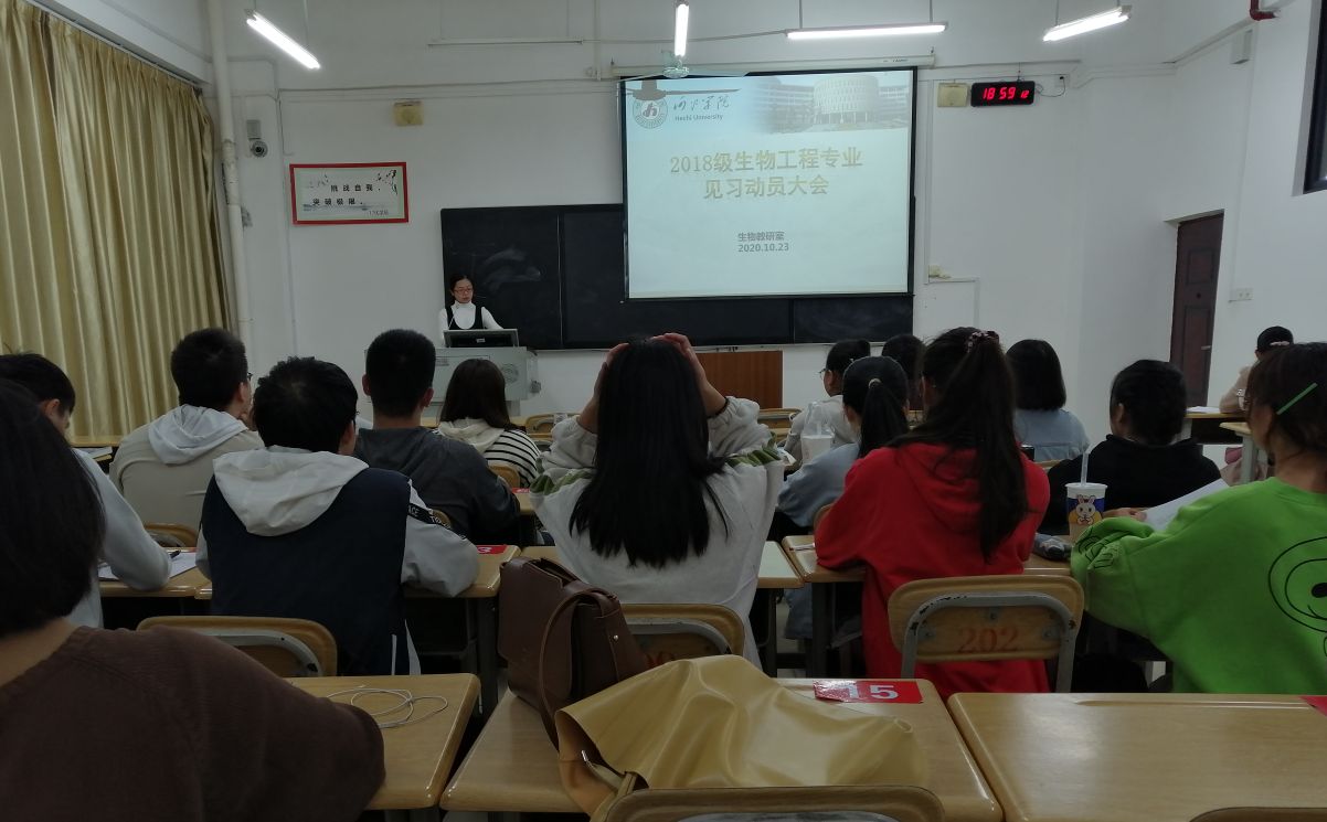 10月23日晚化生学院在格致楼211教室召开2018级生物工程专业的见习动员大会。带队老师覃玥、卢福芝和2018级生物工程专业全体学生参加会议,会议由罗奉奉老师主持。