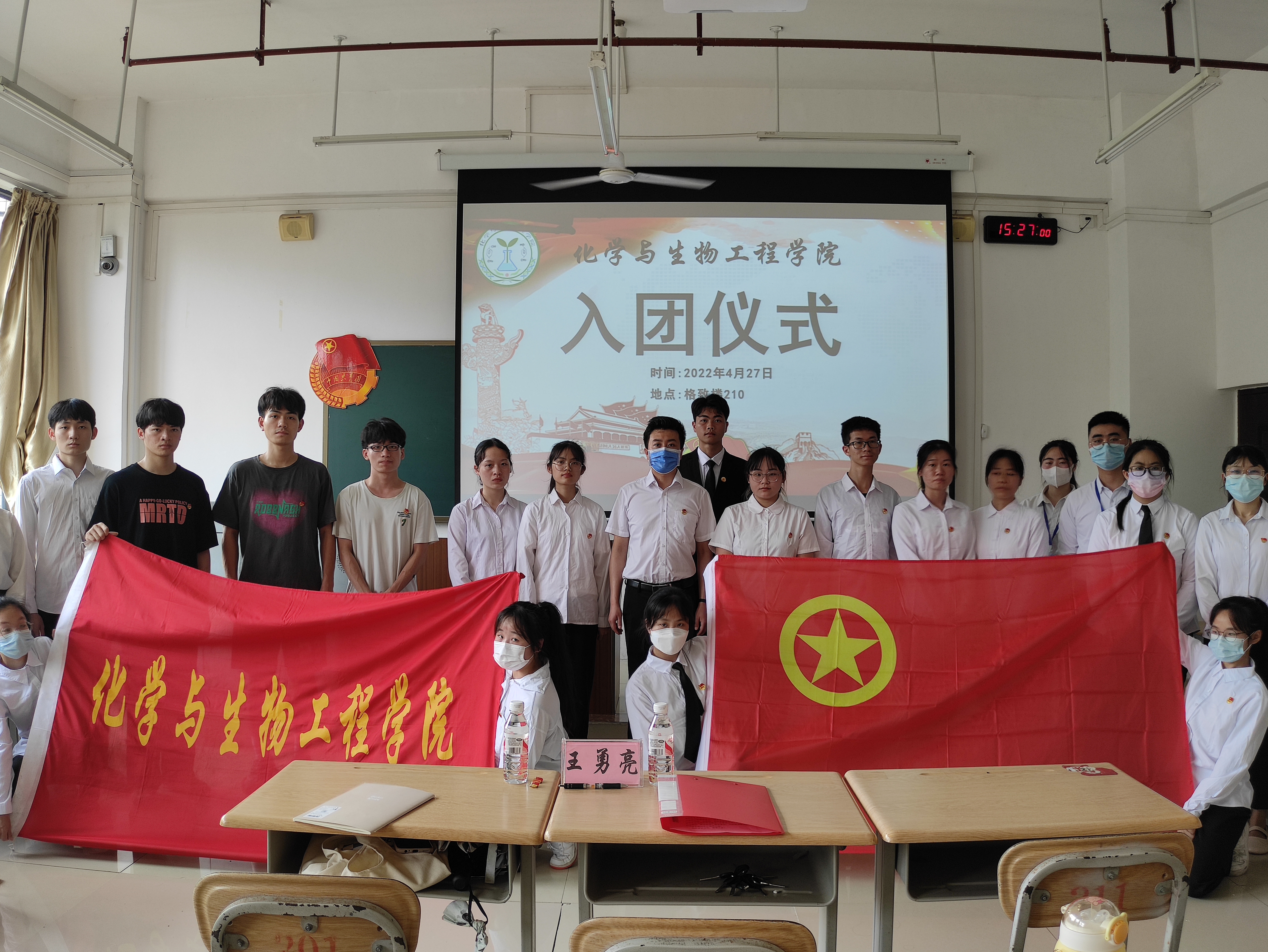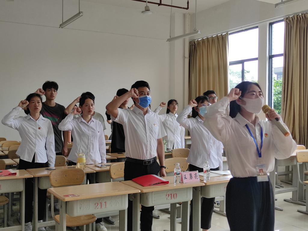 我院于4月27日下午在格致楼210教室举行2022年新团员入团仪式,我院团委书记王勇亮、团委学生副书记黄莹及2022年新团员参加本次入团仪式。