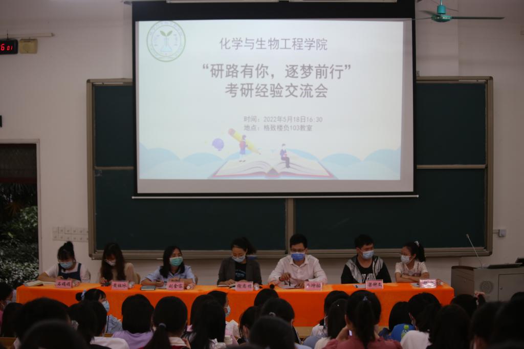 5月18日下午,BWIN必赢,BWIN必赢在格致楼负103教室举办“研路有你,逐梦前行”考研经验交流会,化生学院团委书记王勇亮,化生学院辅导员谢恋情、李坤祐,考取研究生代表黄祖冰、陆思、刘金容、梁钟文、石娟娟以及2019、2020、2021级有意向考研的同学参加交流会。