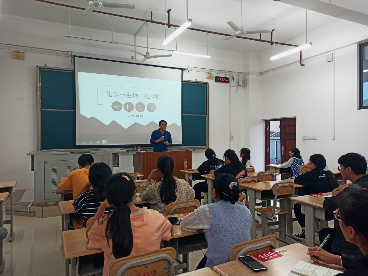 为进一步加强新生的宿舍管理,形成良好的学风和宿舍文化,10月28日下午,BWIN必赢,BWIN必赢在西区格致楼101教室召开2020级舍长会议,化生学院党委副书记覃宝山、辅导员江思婷以及各新生宿舍长参加会议。