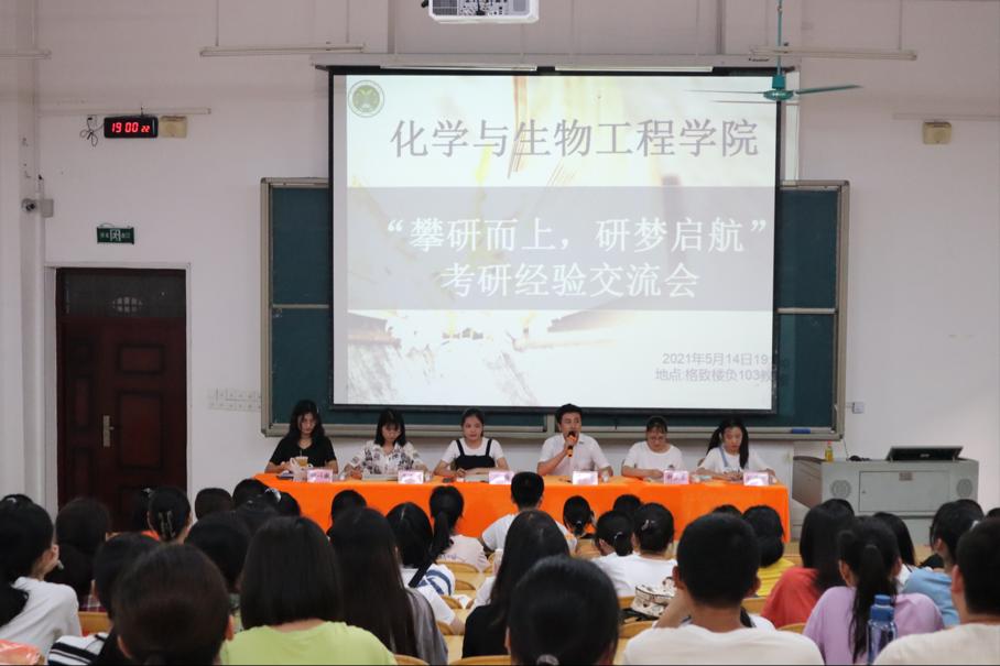 514日下午,化生学院在格致楼负103教室召开“攀研而上,研梦启航”考研经验交流会。考研成功学生刘倩怡、钟兰燕、黄梅、黄惠彬、钟以凝受邀进行经验分享,院团委书记王勇亮出席交流会,我院低年级学生到场聆听。