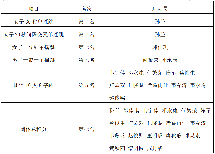 在本次比赛中,我院运动健儿们不仅充分展现精湛的跳绳技艺和不屈不挠的竞技精神,还彰显积极进取、团结协作的精神风貌。希望在未来的比赛中,我院运动员能再接再厉、再创佳绩!(作者:劳心妍 拍摄:劳心妍、李彩琳 校对:劳旻旻 审核:覃宝山)