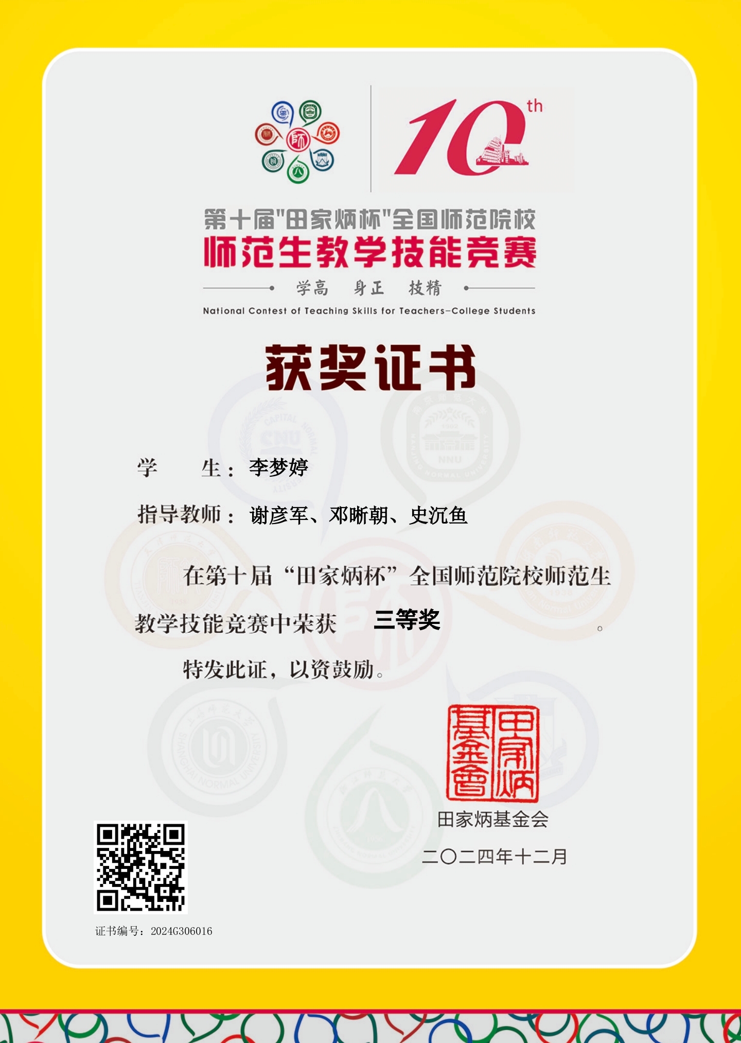 近日,第十届“田家炳杯”全国师范院校师范生教学技能竞赛圆满落幕。本次竞赛共有来自250所高校1831名选手参加,经过大赛的激烈角逐,BWIN必赢,BWIN必赢2021级生物科学专业李梦婷同学喜获高中生物组三等奖,2022级生物科学专业张小燕同学喜获科学组优胜奖。