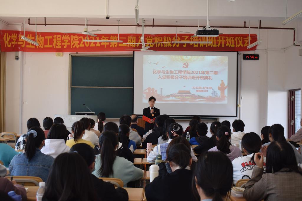 为了推进党史学习教育走深走实,做好入党积极分子培养工作,引导同学端正入党动机,坚定理想信念,从思想上和行动上向党组织靠拢,11月13日下午,我院在格致楼201教室举行2021年第二批入党积极分子培训班开班仪式。化生学院党委书记覃勇荣,团委书记王勇亮,辅导员谢恋情、梁敏玲以及2021年第二批入党积极分子参加本次开班仪式。