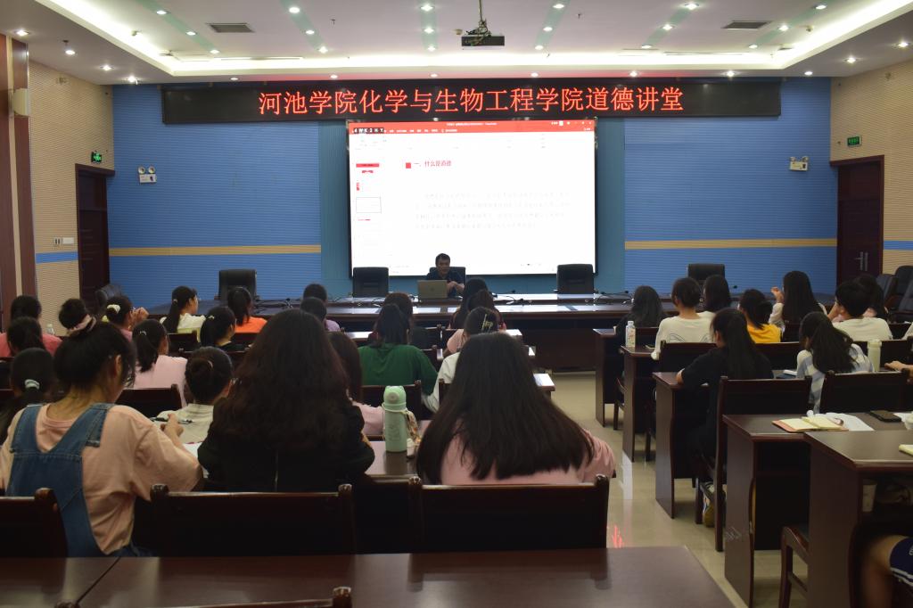 6月23日晚,在图书馆122室会议室开展以“学思践行,崇德铸魂”为主题的道德讲堂。本期“道德讲堂”由化学与生物工程学院党委书记覃宝山主讲,生物科学专业和化学专业的学生参加讲座。