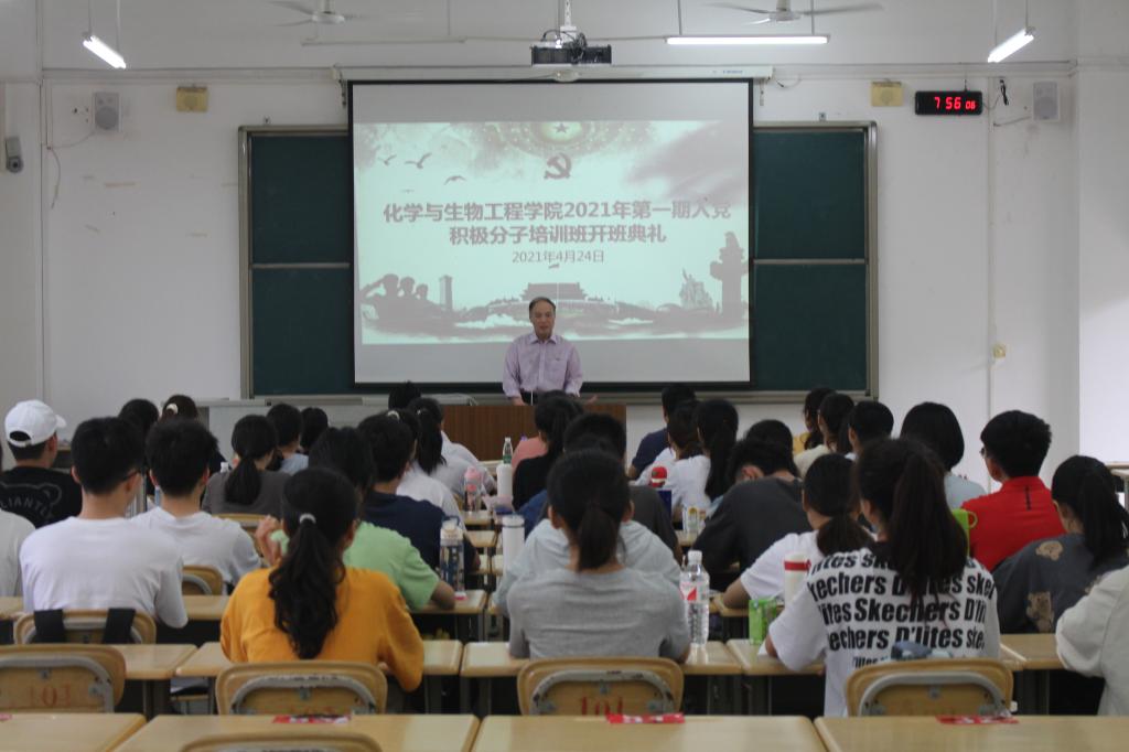 为引导入党积极分子深入学习贯彻党理论知识,全面系统地学习习近平新时代中国特色社会主义思想,增强“四个意识”、坚定“四个自信”、做到“两个维护”,424日上午,我院在格致楼101教室举行2021年第一期入党积极分子培训班开班仪式,化生学院党委书记覃勇荣、团委书记王勇亮、学生第一党支部书记李坤祐出席会议,第一期全体入党积极分子参加开班仪式。