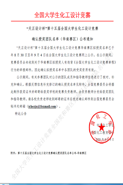 全国大学生化工设计竞赛是由中国化工学会、中国化工教育协会、教育部高等学校化工类专业教学指导委员会举办的,是目前全国高校化工专业级别最高、参赛队伍最多、影响力最大的年度大赛,已被纳入全国普通高校学科竞赛榜单,成为高校培养学生综合素质、创新思维和工程能力的重要推动力量和第二课堂。
