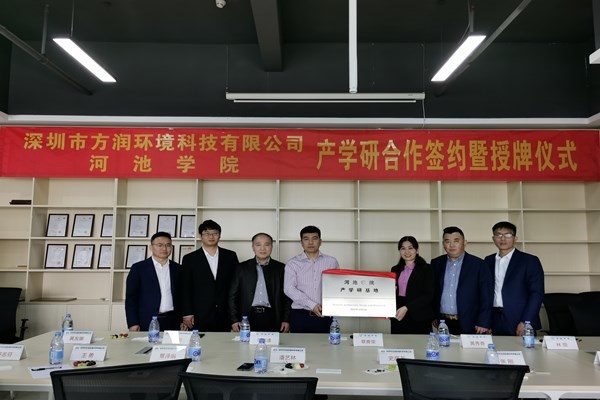 深圳市方润环境科技有限公司董事长张刚、董事史彦龙总经理、董事潘艺林总经理等对我方到来表示热烈欢迎,董事长张刚就企业目前的基本情况和主要业务作了详细介绍,并对我院培养的毕业生的综合能力表示高度的认可,他指出校企合作是双方未来发展的重要方向。黄秀香院长表示校企双方可在人才培养、实习实践、共建实验室、工业废水处理等方面更深入的探讨,并对方润公司在我院设立的奖学金表示感谢,该项奖学金本着“”不断推进校企合作工作。随后,“产学研合作签约暨揭牌仪式“在方润会议室成功举行。双方人员共同参加了此次揭牌仪式。