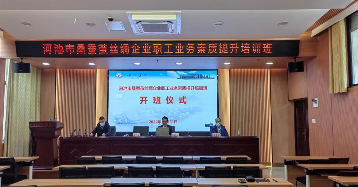 据悉,此次培训方式采用线上和线下教学相结合的方式进行,参训学员分别来自河池市各桑蚕茧丝绸企业的技术人员,共计60人,培训内容涵盖桑蚕循环经济简介、茧丝的质量与桑蚕的种养、茧丝的缫丝工艺技术、茧丝绸的生产管理规范(办法)及质量控制、茧丝绸产业的智能化生产、桑蚕茧丝精细化产品介绍、丝绸纺织工艺技术的发展趋势以及党的二十大精神鼓舞新时期产业工人队伍建设高质量发展与实践案例教学等内容。