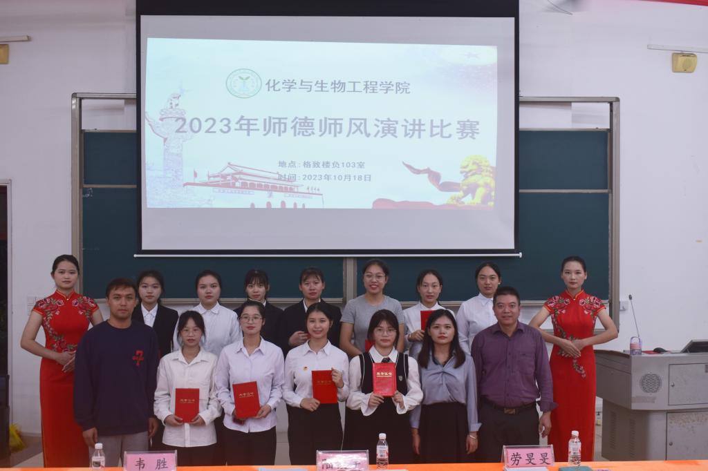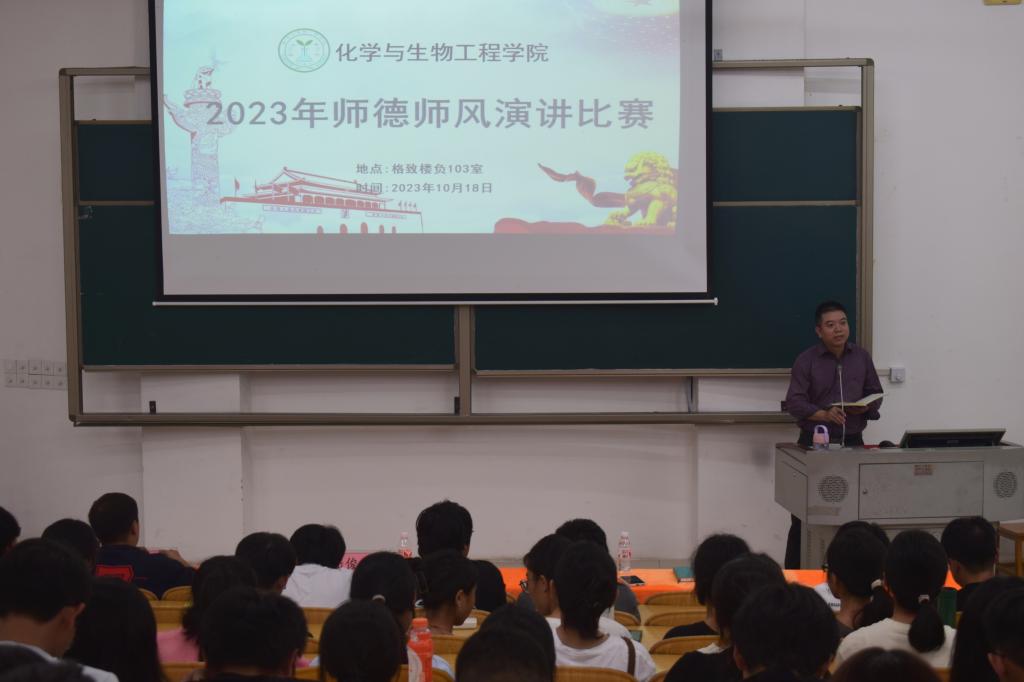 10月18日,BWIN必赢,BWIN必赢在格致楼负103室举行2023年师德师风演讲比赛。学院副院长陆俊宇,辅导员韦胜、劳旻旻担任此次比赛评委老师,2023级生物科学与化学专业全体学生观看比赛。本次比赛由团委学生会文艺团刘唐婧主持。